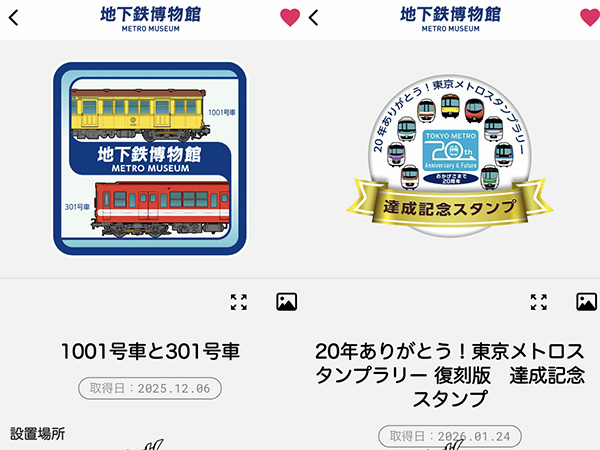 | 東京メトロ前後半に続く地下鉄シリーズの最後は地下鉄博物館です. エキタグ収集10 富士山麓電気鉄道 ←1〜10はこちらより エキタグ収集20 御殿場線90周年記念 ←11〜20はこちらより エキタグ収集30 湘南新宿ライン ←21〜30はこちらより エキタグ収集40 名探偵コナン信州列車旅 ←31〜40はこちらより エキタグ収集50 外房線 ←41〜50はこちらより エキタグ収集60 河口湖線開業75周年記念 ←51〜60はこちらより エキタグ収集61 トキ鉄・北越急行(再) エキタグ収集62 上越線 エキタグ収集63 弥彦線 エキタグ収集64 越後線 エキタグ収集65 信越本線(直江津〜新潟) エキタグ収集66 鶴見線 エキタグ収集67 小海線(再) エキタグ収集68 大阪モノレール エキタグ収集69 北大阪急行電鉄 エキタグ収集70 東京メトロ(1/2) エキタグ収集71 東京メトロ(2/2) 地下鉄博物館は東京メトロ東西線の葛西駅に併設されています. 博物館内のエキタグは,1001号車と301号車の1種類だけなのですが, それに加えて,東京メトロ各路線で設定された20駅のエキタグを全て収集すると, 自動付与されるようになっています(取得日が異なるのはそのため) ![]() 昔の地下鉄車両が展示されているほか,当時の駅ホームの様子を再現した施設もあり, 大人でもなかなか楽しめました. ![]() ![]() ![]() ![]() |