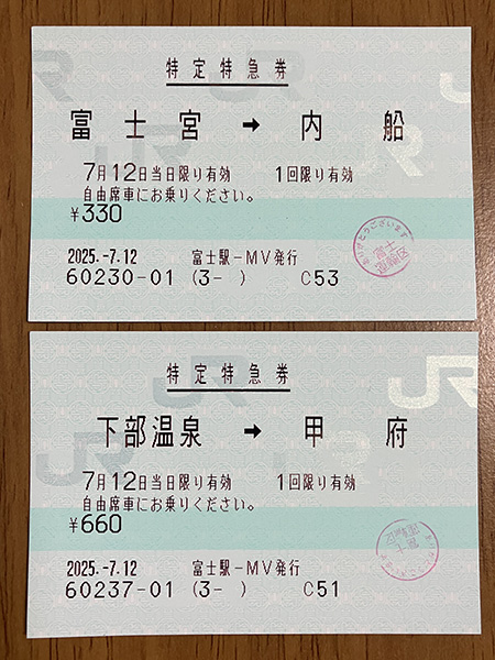 | 先日の身延線での追加エキタグ収集の旅程検討時に知ったんですが, 特急ふじかわには特定特急券というものがあるそうです. 対象区間の甲府〜富士(富士〜静岡は含みません)では, 自由席特急料金が30キロまでが330円,50キロまでが660円と 近距離で割安に設定されています. 列車本数の少ない普通列車を補完する目的で, 近距離でも利用しやすいようにするための特例なんだそうです. ということで,先日の身延線乗車時には積極的に利用してみました. よ〜く見ると切符には「特定特急券」と見慣れない表記がされています. 特に330円の方はお得感が一層強いですね. ![]() 一方でこの特例により裏技のようなテクニックが存在するそうです. 甲府〜内船の自由席特急料金を例にすると,続きで購入した場合は1,200円となりますが, 甲府〜甲斐岩間/甲斐岩間〜内船の2区間に分けて購入すると, それぞれ特例適用となり330円×2=660円とおよそ半額になります. 後者の方法で購入した2枚の特急券で 同じふじかわに乗り通してもルール上は問題はないそうですが, 車掌はあまり良い顔はしないそうです. JRの切符のルールは奥が深いなと改めて感じました. |
