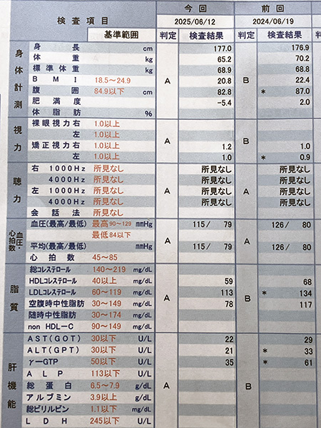 | 先日,6月に受診した健康診断の結果が届きました. 4月に特定保健指導の減量活動の最終報告をしていましたが, その後もリバウンドなく体重を維持していました. そして意外にも腹囲も82.8cmとなりまして脱メタボ民を達成となりました. 腹囲については減量活動の最終報告時点でも85cmは下回っていなかったんですが, 自分で測っていた時よりもメジャーを締め付けて測ってくれ82.8cmになりましたね. (あんなに締め付けて測っていいもんなんですね) また今年は念には念を入れて健康診断前の3日間禁酒しましたので, 肝機能の値も大幅に改善しました. いや〜,いい結果となって良かったです. ![]() |